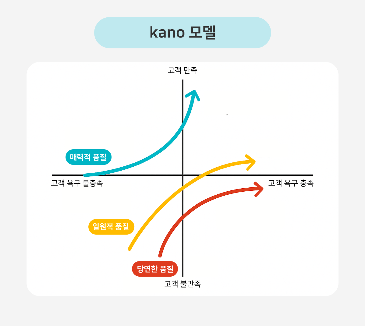 Kano 모델은 ‘기능이 고객 만족에 어떤 영향을 주는지’를 기준으로 분류해 우선순위를 정하는 프레임워크입니다.