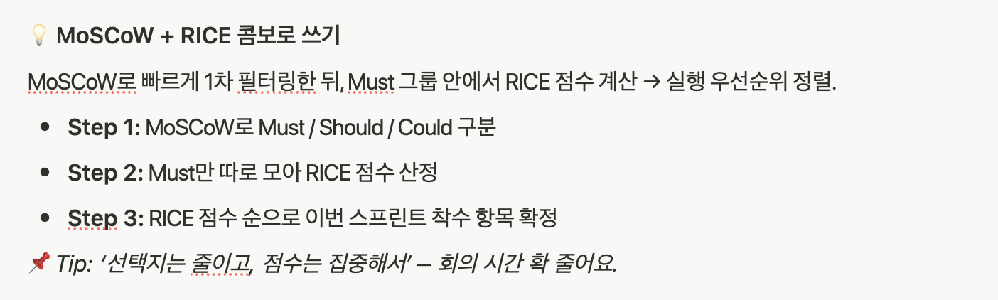 RICE처럼 점수를 매기진 않지만, 단순한 구조 덕분에 빠르게 MVP 범위를 정하거나 스프린트 계획을 세울 때 자주 활용됩니다.