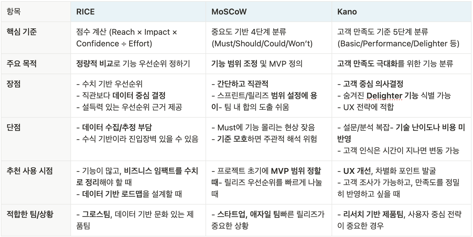 대신 출시 후 피드백이나 간단한 설문 데이터를 바탕으로 기능을 분류하면 훨씬 정확해져요.