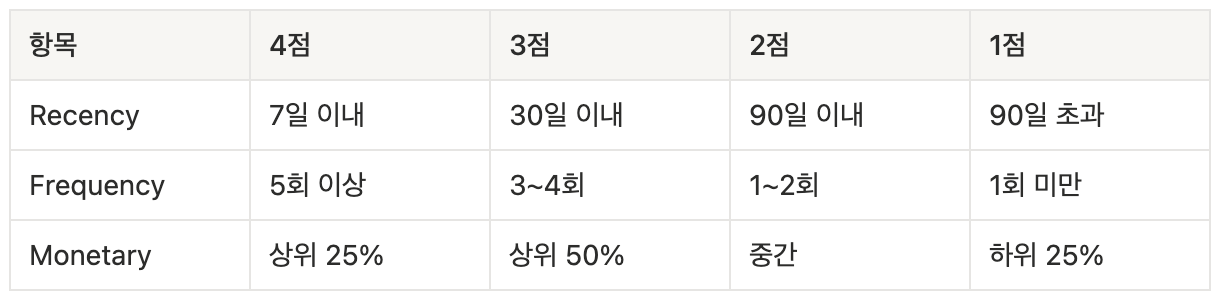 RFM은 보통 각 항목을 1~4점 또는 1~5점으로 나눠 조합해요.