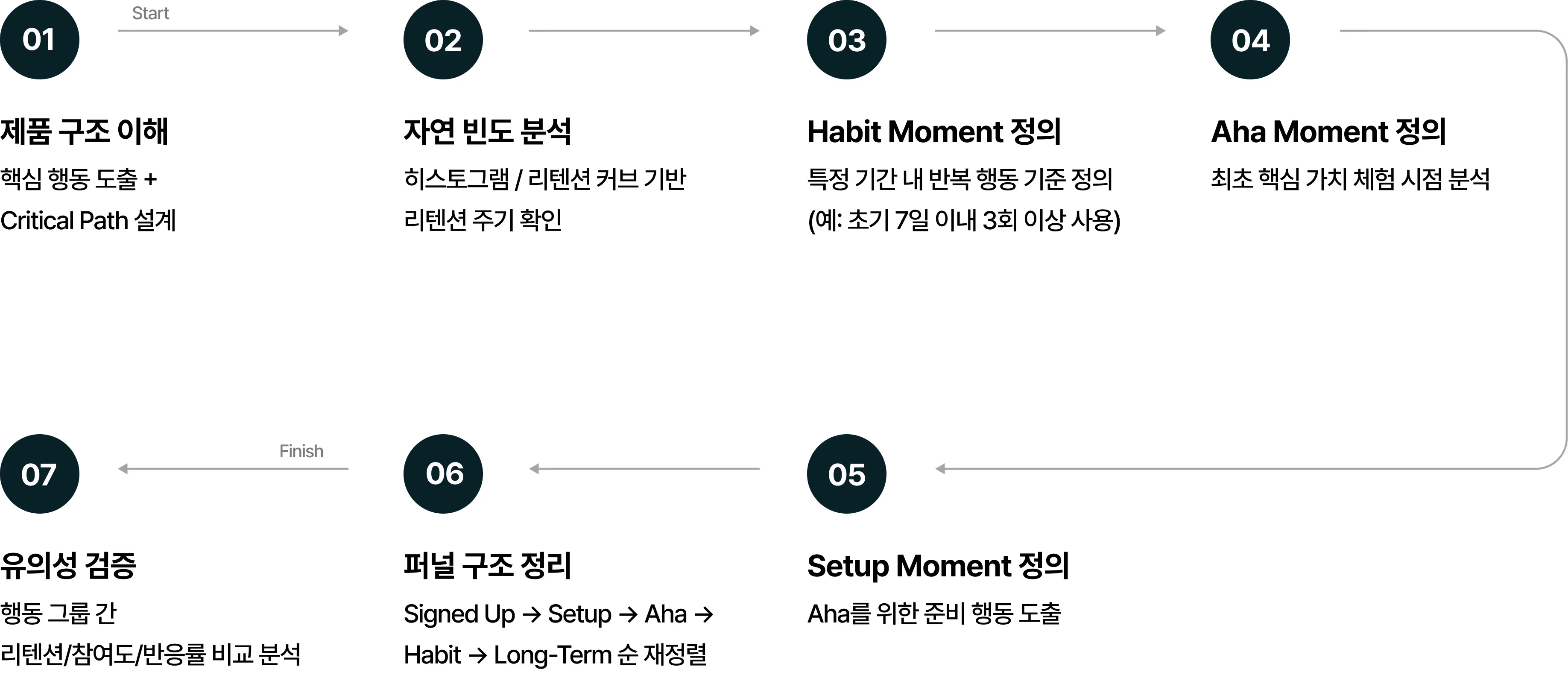 CRC 기반 → Setup → Aha → Habit → Long-term Retention